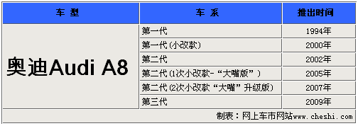 奧迪V8的問(wèn)世標(biāo)志著奧迪開(kāi)始重返闊別了近50年的豪華車市場(chǎng)。1994年3月,作為奧迪V8型轎車的改進(jìn)車型,全鋁車身的奧迪A8首次公開(kāi)亮相,開(kāi)創(chuàng)了奧迪旗艦車型的新紀(jì)元。奧迪A8也是首款裝備全鋁車身的豪華轎車,先進(jìn)的鋁合金車身,在不犧牲結(jié)構(gòu)剛性的前提下有效的降低了體重。