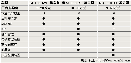 奇瑞新A3和帝豪EC7都采用自動(dòng)空調(diào),而比亞迪L3卻依然采用手動(dòng)機(jī)械式空調(diào),相對(duì)而言有些落伍。奇瑞新A3雖然配備了定速巡航系統(tǒng),在高速駕駛中可以帶來(lái)更多的舒適性,但個(gè)人認(rèn)為也帶來(lái)一定的安全隱患。比亞迪L3配備了DVD系統(tǒng),和帝豪EC7一樣都配備了GPS導(dǎo)航功能。奇瑞新A3配備支持MP3、WMA音頻格式的CD音響,與帝豪EC7一樣都配備6聲道音響系統(tǒng),比比亞迪L3的音響效果應(yīng)該更出色。