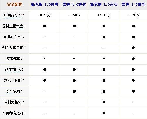 在安全配置方面,兩車的入門版車型基本保持在同一水平,正副駕駛雙安全氣囊和ABS+EBD也是目前主流的入門車型安全配置。而在較高配車型上,?怂乖谥鲃影踩嫌幸欢▋(yōu)勢,其運動版車型擁有牽引力控制和電子穩(wěn)定程序。翼神則在被動安全性上出色一些,側面頭部氣簾僅出現(xiàn)在?怂谷龓廊A型上,而全系標配的膝部氣囊在福克斯的全系都沒有配備。