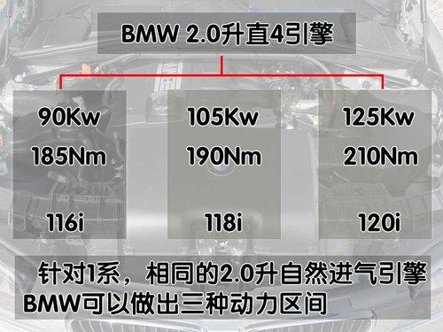 在歐洲市場(chǎng)BMW旗下的1系轎車(chē)在2.0升排量這個(gè)級(jí)別內(nèi),擁有3款細(xì)分車(chē)型,分別是116、118和120。而其他排量的車(chē)型還包括130以及120的柴油車(chē)款,目前中國(guó)市場(chǎng)所銷(xiāo)售的1系為120和130兩個(gè)款式。很難想象一款2.0升級(jí)別的自然進(jìn)氣引擎被BMW弄出了那么多種“花樣”,在歐洲市場(chǎng)就有從90千瓦/185牛米、105千瓦/190牛米到125千瓦210牛米的3種車(chē)款。其中90千瓦/185牛米的入門(mén)車(chē)款被命名為116i屬于BMW 1系當(dāng)中價(jià)位最低的車(chē)款。