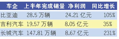 受益于上半年車(chē)市的產(chǎn)銷(xiāo)兩旺,三大車(chē)企的業(yè)績(jī)?nèi)飄紅,其中長(zhǎng)城汽車(chē)取代比亞迪成為業(yè)績(jī)?cè)鲩L(zhǎng)最迅速的民營(yíng)車(chē)企,吉利汽車(chē)忙于整合沃爾沃轎車(chē)業(yè)務(wù),暫時(shí)沒(méi)有突出表現(xiàn)。