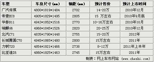 從上表可以看到,這八款新車型瑞麒G6的尺寸最大,車長2968mm、軸距達2820mm,其次是長城騰翼C70,而最先推向市場的很可能是帝豪EC8,預計售價15萬左右,搭載2.0L和2.4L發(fā)動機。剛剛下線的傳祺將于廣州車展上市,預計售價14-20萬元之間。