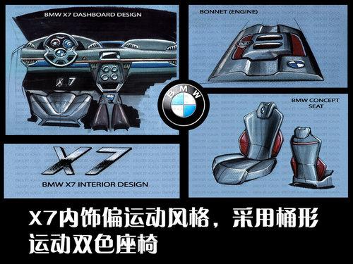 從寶馬X7的內(nèi)飾草圖可以看出偏向運動風(fēng)格,有棱有角的中控臺和不規(guī)則的方向盤彰顯其與眾不同。桶形賽車座椅極富現(xiàn)代感,腰部兩側(cè)支撐與座椅主體采用不同色的搭配。