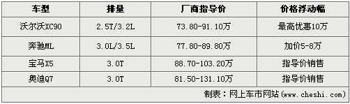 表中顯示清晰,沃爾沃XC90是四款車型中唯一一款出現(xiàn)優(yōu)惠的車型,三個版本全部優(yōu)惠10萬元,性價比表現(xiàn)比較突出;奔馳ML是四位對手中唯一一款加價車型,根據(jù)車型不同加價5-8萬元。寶馬X5和奧迪Q7銷售情況相對穩(wěn)定,以廠商指導價銷售,但Q7 3.0TFSI等等時間較長,有5個月之多。