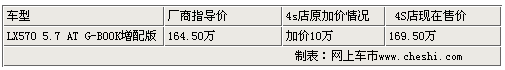 如果提到豪華SUV,大家一定首先想到寶馬X6、奔馳GL、保時捷卡宴以及路虎攬勝等豪華SUV中的“大佬”們,作為國際知名越野極強(qiáng)悍的汽車品牌,雷克薩斯的每一款車型都可謂經(jīng)典,而雷克薩斯LX570又重新詮釋了豪華SUV的新尺度,與上一代的LX470相比,你卻不得不承認(rèn)雷克薩斯的LX系列正在以跨越的方式完成自己的進(jìn)化。近日,近日根據(jù)網(wǎng)上車市價(jià)格檢測系統(tǒng)顯示,目前雷克薩斯豪華SUV-LX570加價(jià)較上段時間的10萬元較少了一半,僅加價(jià)5萬進(jìn)行銷售,而且有現(xiàn)車供應(yīng),具體情況請參照下表: