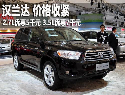 廣汽豐田生產(chǎn)的漢蘭達(dá)Highlander于2009年5月25日正式下線,擁有2.7L和3.5L兩個排量共10款車型,價(jià)格區(qū)間為24.88~42.98萬元。近期,編輯從北京廣汽豐田4S專營店獲悉,漢蘭達(dá)現(xiàn)車充足,優(yōu)惠幅度有所縮水,現(xiàn)金讓利最高7千元。詳情見下表: