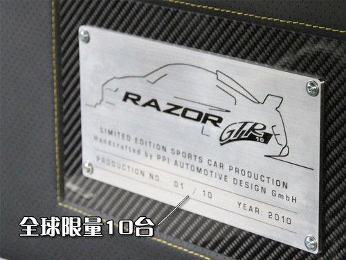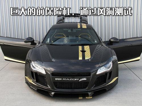 PPI打造的改裝版R8命名為RAZOR GTR-10,這個名字中的10意味只限量改裝10臺。RAZOR GTR-10是一款高性能全碳纖維輕量化超級跑車,前臉換裝了巨大的碳纖維運動前保險杠,完美的運用了空氣動力學(xué)并通過了風洞測試。前備箱蓋一側(cè)有兩條金色賽道紋貫穿車身前后。