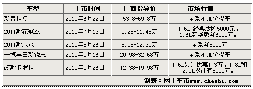 從上表我們可以看出,豐田的五款車集中上市在夏秋季節(jié),這也正是產(chǎn)品上市的最佳時(shí)期,老車型進(jìn)行清庫,新車的更新?lián)Q代升級(jí),廠商指導(dǎo)價(jià)相對(duì)原來保持不變活略低一些。熱點(diǎn)車型市場(chǎng)波動(dòng)相對(duì)來說較小,維持一種穩(wěn)定的價(jià)格區(qū)間內(nèi),但非熱門車型波動(dòng)幅度稍微大了些,商家的變相促銷方式層出不窮,具體詳情請(qǐng)見下面的進(jìn)一步的分析:
