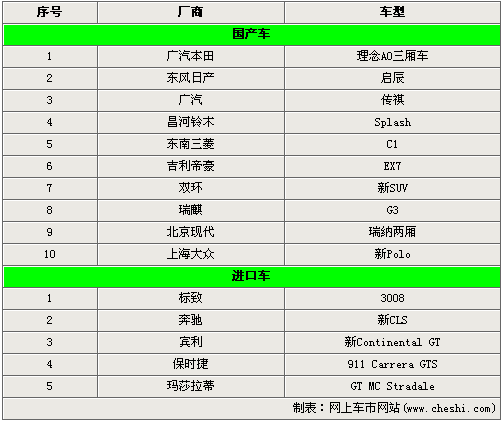 在本屆廣州車展上,預計將有10款國產(chǎn)新車和5款進口新車首發(fā),其中廣汽本田理念A0三廂車、東風日產(chǎn)啟辰、昌河鈴木Splash等新車都是首次亮相,而其他如傳祺、東南C1、瑞麒G3等車型很可能在廣州車展上市。在進口車方面,標致3008、奔馳新CLS等將亮相廣州,另外豪華品牌賓利、保時捷、瑪莎拉蒂等都有新車發(fā)布。