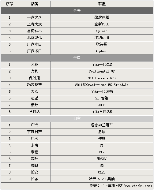 從表中可以看出,在2010年第四季度(10-12月)共有23款新車將于消費(fèi)者見(jiàn)面。合資品牌品牌共有6款車型登場(chǎng),上海大眾的全新POLO和廣汽本田的歌詩(shī)圖是關(guān)注度相對(duì)高的兩款明星車型;進(jìn)口陣營(yíng)中奔馳全新CLS已經(jīng)被炒得非;馃,而售價(jià)低很多的起亞SL-智跑則會(huì)引起共多SUV愛(ài)好者的注目;自主幫派以9款新車雄居榜首,第四季度這部分的特點(diǎn)在于有全新的品牌加入戰(zhàn)局,廣汽、東風(fēng)等合資品牌都將下一步的計(jì)劃投身到自主品牌的浪潮之中。