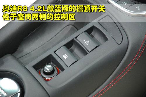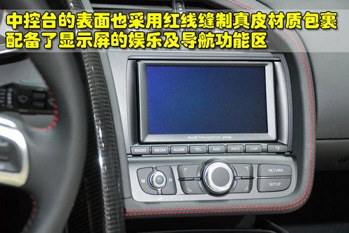 奧迪R8 4.2L敞篷版的中控臺(tái)周?chē)疾捎谜嫫ぐ,并且紅線縫制顯得運(yùn)動(dòng)感更強(qiáng)。中控臺(tái)兩側(cè)都采用了輕量化碳纖維裝飾板。中控臺(tái)頂部配備了大尺寸顯示屏,娛樂(lè)功能和導(dǎo)航功能都一應(yīng)俱全。奧迪R8 4.2L敞篷版的頂棚開(kāi)關(guān)位于中央扶手前的位置,獨(dú)立的設(shè)計(jì)方便方便駕駛員或操作。