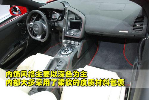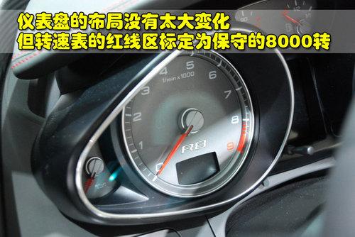 奧迪R8 4.2L敞篷版采用的是紅線手工縫制的三幅式真皮方向盤(pán),并且配備了多功能按鍵。儀表盤(pán)的布局與5.2L車(chē)型并沒(méi)有太多變化,但由于引擎動(dòng)力的減弱,轉(zhuǎn)速表的紅線區(qū)標(biāo)定為相對(duì)比較保守的8000轉(zhuǎn)。