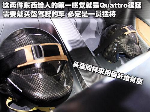 座椅后面是兩塊小型除霧空間,不過這里配備了兩個(gè)頭盔。沒錯(cuò),駕駛奧迪Quattro概念車是需要頭盔的,因?yàn)樗窃谔焯珡?qiáng),頭盔的面料同樣采用碳纖維設(shè)計(jì)。