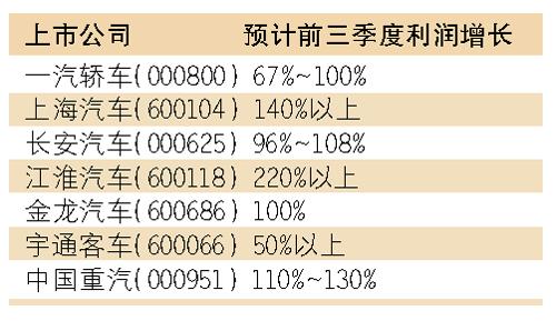 在車市產(chǎn)銷兩旺的背景下,汽車股前三季度業(yè)績狂飆。截至上周,大部分整車汽車股發(fā)布前三季度的業(yè)績預測,多數(shù)前三季度的凈利潤增長超過100%。良好的業(yè)績也刺激著汽車股股價不斷創(chuàng)出新高,由于業(yè)界猜測鼓勵汽車消費的政策可能在今年到期,因此到年底還將迎來一次銷售的大好形勢。