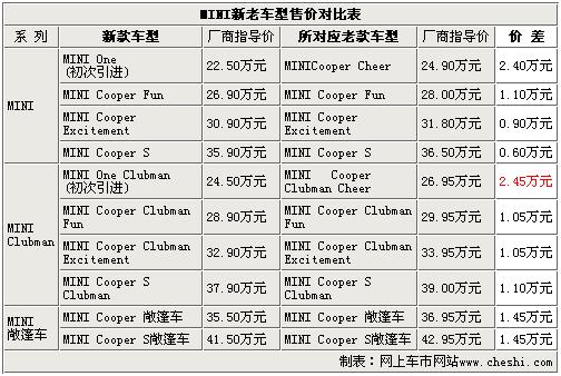 小改款的寶馬MINI全系車型于日前正式在國(guó)內(nèi)上市,2011款MINI分別搭載3個(gè)發(fā)動(dòng)機(jī)系列One、Cooper和Cooper S的8個(gè)車型,共10款車。新車型在設(shè)計(jì)以及動(dòng)力系統(tǒng)方面進(jìn)行了升級(jí),售價(jià)區(qū)間為22.5-41.5萬元與老款車型相比最高降幅接近2.5萬元。通過下面的對(duì)比解析我們一同來了解下新老款MINI在價(jià)格以及其它方面究竟有哪些主要的變化。