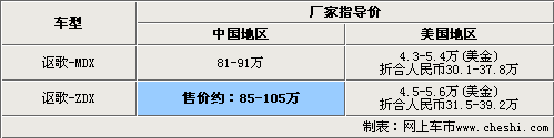 謳歌SUV車型MDX和謳歌跨界車ZDX同屬于一個級別的車型,它們的軸距都是2750mm。但是謳歌ZDX的車身要比MDX長,而身高度則低于MDX,這樣的設計完全符合跨界車(運動型多功能跑車)的定位。目前謳歌MDX在中國地區(qū)的售價為81-91萬,通過謳歌MDX在美國地區(qū)的售價,我們預計謳歌ZDX引入中國地區(qū)的售價約為85-105萬(謳歌ZDX目前美國地區(qū)的指導價為4.5-5.6萬美金,折合人民幣為31.5-39.2萬元)。