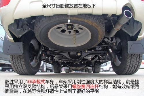 馭勝采用了非承載式車(chē)身,車(chē)架采用剛性強(qiáng)度大的梯型結(jié)構(gòu),前懸掛采用獨(dú)立雙叉臂結(jié)構(gòu),后懸架采用螺旋簧四連桿結(jié)構(gòu),能有效減緩路面震蕩,這樣的設(shè)計(jì)在越野性和舒適性上會(huì)有很好的平衡。
