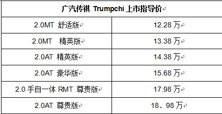 有媒體評(píng)論,廣汽傳祺Trumpchi上市發(fā)布會(huì)無(wú)論是地點(diǎn)的選擇、嘉賓的人數(shù)還是現(xiàn)場(chǎng)氣勢(shì)的營(yíng)造,都創(chuàng)下了業(yè)界的多個(gè)第一,堪稱國(guó)內(nèi)有史以來規(guī)模最宏大的新車上市儀式。而12.28萬(wàn)——18.98萬(wàn)元極具競(jìng)爭(zhēng)力的定價(jià),輔以完善的“加分服務(wù)”,使得廣汽傳祺Trumpchi一上市便成為中高級(jí)轎車陣營(yíng)2.0L級(jí)別最具性價(jià)比優(yōu)勢(shì)的車型?梢灶A(yù)見的是,依托廣汽集團(tuán)強(qiáng)大的品牌號(hào)召力和品質(zhì)口碑,廣汽傳祺Trumpchi必將一炮而紅,成為中高級(jí)轎車市場(chǎng)的全新標(biāo)桿。