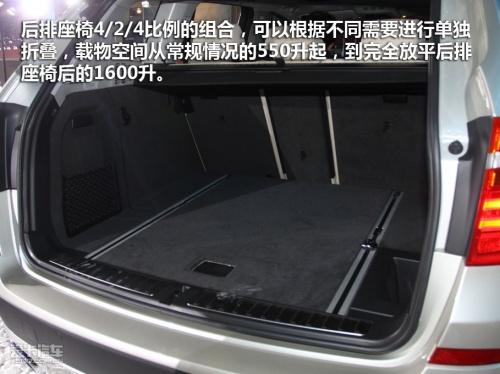 行李廂空間也是新X3的賣點之一,后排座椅4/2/4比例的組合,可以根據(jù)不同需要進行單獨折疊,載物空間從常規(guī)情況的550升起,到完全放平后排座椅后的1600升,充分滿足寶馬X3車主的需要。