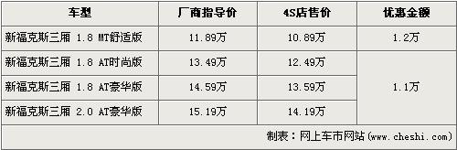 ?怂棺06年8月份上市以來(lái),其憑借動(dòng)感前衛(wèi)的外形以及動(dòng)力充沛的性能配置博得了不少年輕時(shí)尚小齡青年的喜愛(ài),使此車(chē)的銷(xiāo)量一直保持的比較穩(wěn)定。近日據(jù)網(wǎng)上車(chē)市價(jià)格監(jiān)測(cè)系統(tǒng)顯示:新款福克斯全系最高優(yōu)惠1.2萬(wàn)元,具體詳情請(qǐng)看下表: