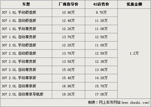 2007年9月22日,全新一代的東風(fēng)標(biāo)致307在眾多消費(fèi)者的熱切期盼中新悅登場(chǎng)。新東風(fēng)標(biāo)致307全系多達(dá)九種顏色共十三款車型,價(jià)格從10.98萬元--16.58萬元。近日根據(jù)網(wǎng)上車市價(jià)格監(jiān)測(cè)系統(tǒng)顯示,現(xiàn)在三廂標(biāo)致307全系優(yōu)惠1.2萬元,具體車型以及價(jià)格如下: