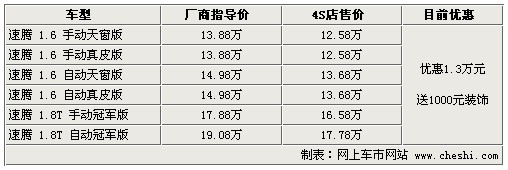 據(jù)4S店銷售人員介紹:目前速騰全系優(yōu)惠1.3萬元,較之前優(yōu)惠幅度有所增加,如在店內做一條龍服務還可獲贈價值1000元的裝飾,裝飾主要包括腳墊、座套等。由于2.0升車型停產,所以目前只有1.6升和1.8TSI車型。1.6升車型更注重經濟型,而1.8TSI更加注重動力表現(xiàn)。