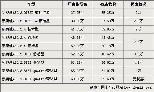 據(jù)銷售人員介紹,目前奧迪A6L全系可以最高優(yōu)惠4.9萬元。奧迪A6L全系分為2.0T FSI,2.4L,2.8 FSI,3.0 FSI四種共10個車型,最低配的2.0TFSI標準型經2萬元優(yōu)惠后售價降到了35.25萬元,而2.8FSI 豪華版經全系最高的4.9萬元優(yōu)惠后售價也降到了56.92萬元。全系最高配的3.0FSI quattro豪華版目前店內沒有現(xiàn)車,欲購買的消費者需要交1萬元訂金,約等3個月后方可提車。