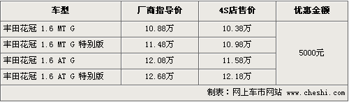 國產(chǎn)花冠已經(jīng)是其第九代產(chǎn)品,尤其值得稱道的是其VVT-i發(fā)動(dòng)機(jī),這是豐田國產(chǎn)車型中首款采用此發(fā)動(dòng)機(jī)的車型。國產(chǎn)后這款車的表現(xiàn)依然如日中天,成為一汽豐田的看家產(chǎn)品。根據(jù)網(wǎng)上車市價(jià)格監(jiān)測(cè)系統(tǒng)顯示,目前花冠全系車型出現(xiàn)了5000元的優(yōu)惠幅度,具體車型以及優(yōu)惠如下: