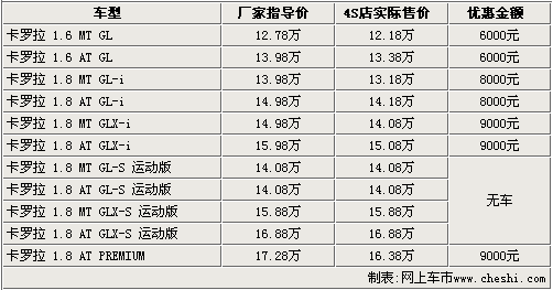 據(jù)一汽豐田4S店銷售人員介紹:目前2.0L排量的運動版車型無現(xiàn)車銷售,購買其他車型則可以享受到8000元——9000元的現(xiàn)金優(yōu)惠。入門級的1.6 MT GL版車型售價降到了12.18萬元,高配的1.8 AT PREMIUM版經(jīng)9000元優(yōu)惠后,售價也降到了16.38萬元。