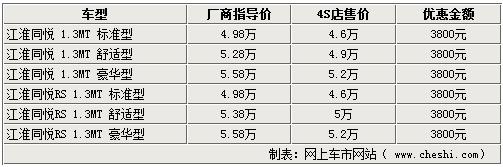 江淮的同悅及同悅RS系列車型,自上市后就吸引了眾多消費(fèi)者關(guān)注。在三廂車型銷售很長(zhǎng)時(shí)間之后,兩廂的RS版終于進(jìn)入了北京市場(chǎng)開始銷售。網(wǎng)上車市網(wǎng)站由江淮轎車經(jīng)銷商處了解到,現(xiàn)在RS版以及三廂同悅車型店內(nèi)現(xiàn)車充足,購(gòu)車最高可有3800元的現(xiàn)金優(yōu)惠。具體詳情如下: