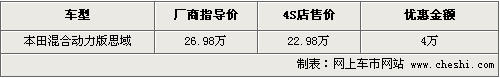 隨著油價(jià)的不斷上調(diào),消費(fèi)者的用車成本不斷增加,混合動(dòng)力車型開(kāi)始成為許多消費(fèi)者選購(gòu)的對(duì)象,其中本田進(jìn)口的混合動(dòng)力版思域在性價(jià)比方面逐漸凸顯其優(yōu)勢(shì),目前筆者了解,這款車最高優(yōu)惠幅度達(dá)到了4萬(wàn)元,優(yōu)惠后與普通車型差距逐漸減小,具體車型以及價(jià)格如下:
