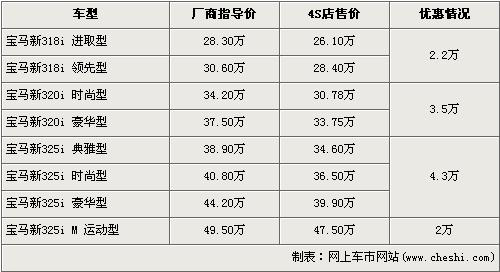 新寶馬3系在去年12月份正式在國(guó)內(nèi)市場(chǎng)正式上市銷售,經(jīng)過(guò)改款后的3系從外觀的流線,到內(nèi)飾的風(fēng)格均有一定程度的變化,帶給消費(fèi)者的是全新的視覺(jué)沖擊和駕馭樂(lè)趣。根據(jù)網(wǎng)上車市價(jià)格監(jiān)測(cè)系統(tǒng)顯示,新寶馬3系車型全系出現(xiàn)了不同的現(xiàn)金優(yōu)惠,最高優(yōu)惠達(dá)到了4.3萬(wàn)元,具體車型價(jià)格如下: