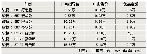 據(jù)4S店銷售人員介紹,駿捷全系車型已經(jīng)分為1.6L、1.8L、1.8T三個(gè)排量,目前1.6L車型在商家給出4800元優(yōu)惠后,舒適版和豪華版車型售價(jià)分別降到了8.10萬(wàn)元和9.10萬(wàn)元。1.8L車型優(yōu)惠1.7萬(wàn)元,經(jīng)優(yōu)惠后舒適版和豪華版車型售價(jià)分別降到了8.78萬(wàn)元和9.78萬(wàn)元。1.8T的舒適版車型經(jīng)全系最高的2萬(wàn)元優(yōu)惠后,售價(jià)降到了10.78萬(wàn)元,跌破了11萬(wàn)元。