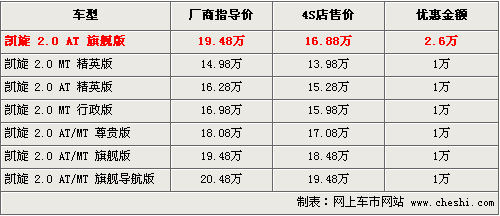 東風雪鐵龍凱旋在同級別車型中性價比較高,前沿的中控臺設計,中央集控式方向盤、EPS+GPS導航等豐富的配置均在凱旋上能夠看到。根據(jù)網(wǎng)上車市價格檢測系統(tǒng)顯示,目前個別商家針對凱旋推出了特價車型,優(yōu)惠幅度達2.6萬元,并可以獲得部分禮品,具體車型和價格如下: