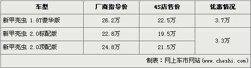 據(jù)4S店銷售人員介紹:目前甲殼蟲全系有最高3.7萬元的優(yōu)惠。經(jīng)3.7萬元優(yōu)惠后,1.8T豪華型售價從26.2萬元下降到了22.5萬元。2.0L的標配版和頂配版經(jīng)3.3萬元優(yōu)惠后,售價分別將為了19.5萬元和21.5萬元。