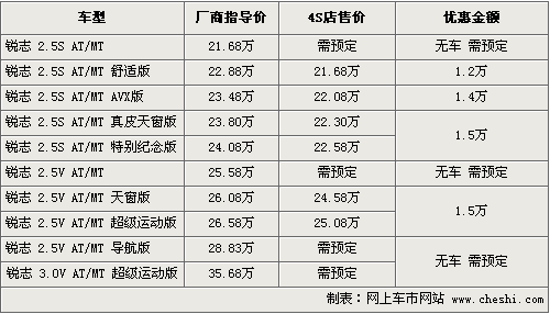 據(jù)4S店銷(xiāo)售人員介紹,目前豐田銳志全系最高可以?xún)?yōu)惠到1.5萬(wàn)元,其中2.5S舒適版優(yōu)惠為1.2萬(wàn)元,AVX版優(yōu)惠1.4萬(wàn)元,同時(shí)部分可以還可贈(zèng)送便攜式導(dǎo)航。目前現(xiàn)車(chē)主要有紅色、銀色等可供消費(fèi)者選擇。導(dǎo)航版以及超級(jí)運(yùn)動(dòng)版車(chē)型仍需要預(yù)訂,訂金為5000元,需要等一個(gè)月左右時(shí)間。