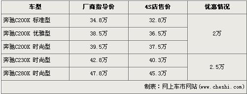 奔馳C級(jí)轎車一直就是奔馳里最暢銷的車型,它的總銷量占到了奔馳總銷量的三分之一。目前,國內(nèi)銷售的奔馳C級(jí)轎車是去年新上市的全新C級(jí)車型,全系分為C200K、C230和C280三種類別共5款車型,售價(jià)區(qū)間為34.8萬元-47.8萬元。近日據(jù)北京奔馳經(jīng)銷店銷售人員介紹,目前奔馳C級(jí)全系最高優(yōu)惠2.5萬元,具體詳情請(qǐng)看下表:
