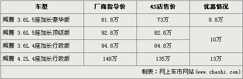 據(jù)北京進(jìn)口大眾經(jīng)銷店銷售人員介紹,目前輝騰3.6L 5座加長(zhǎng)豪華版有8.8萬(wàn)元的現(xiàn)金優(yōu)惠,經(jīng)優(yōu)惠后3.6L 5座加長(zhǎng)豪華版的售價(jià)降到了73萬(wàn)元,跌破了75萬(wàn)元。排量稍大的4.2L 4座加長(zhǎng)行政版有13萬(wàn)元的優(yōu)惠,經(jīng)優(yōu)惠后售價(jià)從148萬(wàn)元下降到了135萬(wàn)元。銷售人員還介紹,4.2L輝騰沒有現(xiàn)車,欲購(gòu)買的消費(fèi)者需交訂金10萬(wàn)元預(yù)訂。