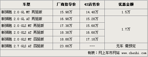 東風(fēng)悅達起亞獅跑和北京現(xiàn)代途勝屬于同平臺車型,但相比途勝,獅跑外觀更有活力。現(xiàn)售的09款獅跑在外觀和內(nèi)飾上的改變并不明顯,目前全系車型最高可以優(yōu)惠現(xiàn)金1.7萬,具體行情如下: