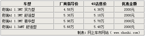 09款奇瑞A1系列在老款車(chē)型的基礎(chǔ)上增加了實(shí)力型和AMT兩種新車(chē)型,同時(shí)舒適型和豪華型官方降價(jià)4000元,售價(jià)已進(jìn)入五萬(wàn)元以?xún)?nèi)。網(wǎng)上車(chē)市網(wǎng)站近日了解到,各家4S店內(nèi)的新車(chē)價(jià)格有所變化,全系車(chē)型均可小幅優(yōu)惠2000元。詳情如下:
