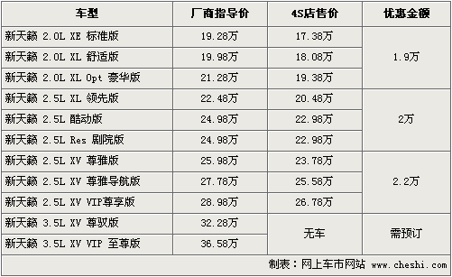 在中級(jí)車行列中,新天籟在舒適性和空間方面具有自己獨(dú)特的優(yōu)勢(shì),尤其在車內(nèi)部座椅的乘坐感受方面,可謂獨(dú)樹一幟,新天籟在一系列升級(jí)后成為消費(fèi)者選購(gòu)的熱點(diǎn)車型之一。根據(jù)網(wǎng)上車市價(jià)格監(jiān)測(cè)系統(tǒng)顯示,新天籟為增加市場(chǎng)競(jìng)爭(zhēng)力,優(yōu)惠幅度有所加大,全系最高優(yōu)惠2.2萬(wàn)元。具體行情如下: