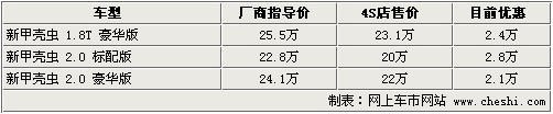 據(jù)4S店銷售人員介紹:目前甲殼蟲硬頂版本車型共有3款,1.8T車型車源較為緊張。2.0升兩款車型目前顏色較為齊全,有綠色、紅色、米色車款,可優(yōu)惠2.1萬-2.8萬。1.8T車型只有天空藍(lán)顏色,且現(xiàn)車非常少,優(yōu)惠幅度為2.4萬元。如需預(yù)定其他顏色車型,需等待1-2周時(shí)間。