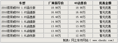 2010款榮威550上市后,隨著廠家產(chǎn)能的逐步提升,各家4S店的貨源問(wèn)題早已得到解決。據(jù)網(wǎng)上車市網(wǎng)站了解,目前北京地區(qū)的榮威4S店里的550全系現(xiàn)車比較充裕,暫時(shí)沒有現(xiàn)金優(yōu)惠,而老款車型各店已經(jīng)基本售空。具體詳情如下: