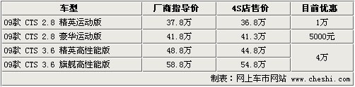 據(jù)4S店銷(xiāo)售人員介紹:目前在售的凱迪拉克09款CTS共有2.8L和3.6L兩個(gè)排量車(chē)型。這4款車(chē)型中,3.6升車(chē)型優(yōu)惠幅度較大,2款車(chē)可優(yōu)惠4萬(wàn)元;而2.8升車(chē)型優(yōu)惠較少,豪華運(yùn)動(dòng)版僅優(yōu)惠5000元。目前3.6升車(chē)型為數(shù)不多,喜歡的朋友請(qǐng)盡快與店內(nèi)聯(lián)系。顏色方面,2.8升精英運(yùn)動(dòng)版車(chē)型有白色、銀色、金色,2.8升豪華運(yùn)動(dòng)版有紅色車(chē)型,3.6升車(chē)型有紅色、灰色車(chē)型。另外,年底或明年初將上市新款凱迪拉克CTS,并配備3.0升直噴發(fā)動(dòng)機(jī),對(duì)此車(chē)感興趣的朋友請(qǐng)隨時(shí)關(guān)注。