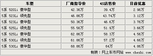 據(jù)4S店銷售人員介紹:目前寶馬5系最高優(yōu)惠4.86萬元,部分車型有現(xiàn)車。520Li領先型由于銷量不好,所以暫時停產(chǎn),目前2.0排量車型只有520Li豪華型。523Li系列車型只有523Li豪華型有現(xiàn)車,但顏色不全只有銀色黑內飾車款,如預定523Li領先型需等1-2個月時間。525Li系列豪華型有現(xiàn)車,顏色為銀色、白色及灰色,525Li領先型車款預訂需等1個月時間。530Li領先型有金色、銀色現(xiàn)車,530Li豪華型有灰色現(xiàn)車。目前最高優(yōu)惠可達4.86萬元,優(yōu)惠幅度較大。