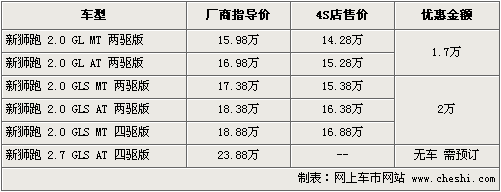 東風(fēng)悅達(dá)起亞獅跑和北京現(xiàn)代途勝屬于同平臺車型,但相比途勝,獅跑外觀更有活力。現(xiàn)售的09款獅跑,時(shí)尚的外觀和改款后配置的重新升級,使獅跑在同級別中的性價(jià)比進(jìn)一步提升。根據(jù)網(wǎng)上車市價(jià)格監(jiān)測系統(tǒng)顯示,目前獅跑最高優(yōu)惠現(xiàn)金2萬元,具體行情如下: