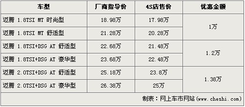 邁騰是一汽大眾主打中級車市場的車型,自上市以來一直受到了好評。今年3月份搭載DSG雙離合變速器的全新邁騰上市,缸內(nèi)直噴發(fā)動機匹配DSG雙離合變速器的完美結合另邁騰再一次的成為了焦點。近日據(jù)網(wǎng)上車市價格系統(tǒng)監(jiān)測顯示,邁騰全系最高優(yōu)惠1.38萬元,具體價格詳情請看下表: