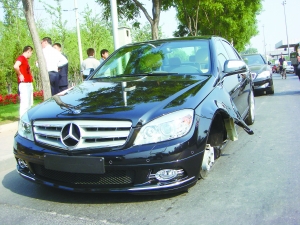 昨天下午2時30分許,來自內(nèi)蒙古赤峰市的李先生,在清河附近的博瑞祥馳汽車銷售服務(wù)中心新買了一輛奔馳轎車。沒想到新買的“大奔”剛上路不到1公里,左前輪就飛了出去,好在當時的車速不快,李先生幸未受傷。