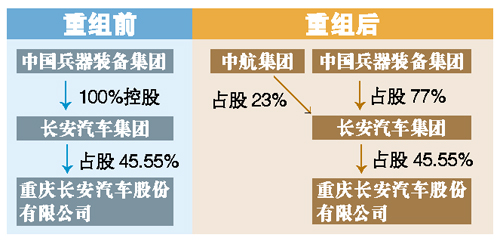 與此前“中航將汽車資產無償劃撥給長安汽車集團”的報道不同, 根據(jù)重組方案,中航工業(yè)以其持有的昌河汽車、哈飛汽車、東安動力、昌河鈴木、東安三菱的股權,劃撥給兵裝集團旗下的中國長安汽車集團;兵裝集團將旗下中國長安汽車集團23%的股權劃撥給中航工業(yè)。兩集團重組成立新的中國長安汽車集團股份有限公司,兵裝集團持股77%、中航工業(yè)持股23%。
