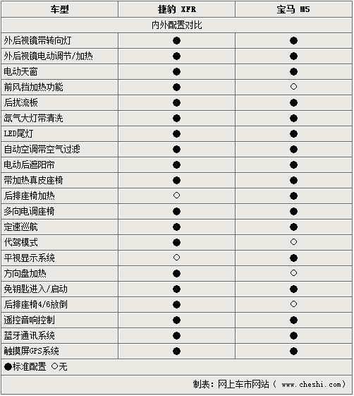既然提到兩款車均為豪華車型,舒適配置當然也是不能被忽視的一面。捷豹XFR則在此方面表現的可圈可點,多項高端配置均一一齊備。而價格相差3萬的寶馬M5在此方面則略顯遜色,看來寶馬車型更加在乎駕駛樂趣。但從此方面則證明了捷豹XFR為有機會乘坐其中的駕乘者想的更多,不僅滿足了駕駛與運動的樂趣,也可直接享受更多的舒適及便利。